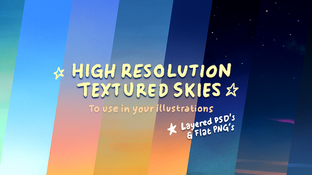 High-resolution Skies to start you off on your illustrations. These files contain multiple layers with textures to create lovely sky gradients that are super handy to use as the backdrops to your images. Grab these layered files and see a breakdown of how I build the atmosphere for a sky, and acquire a great collection of skies for your usage.