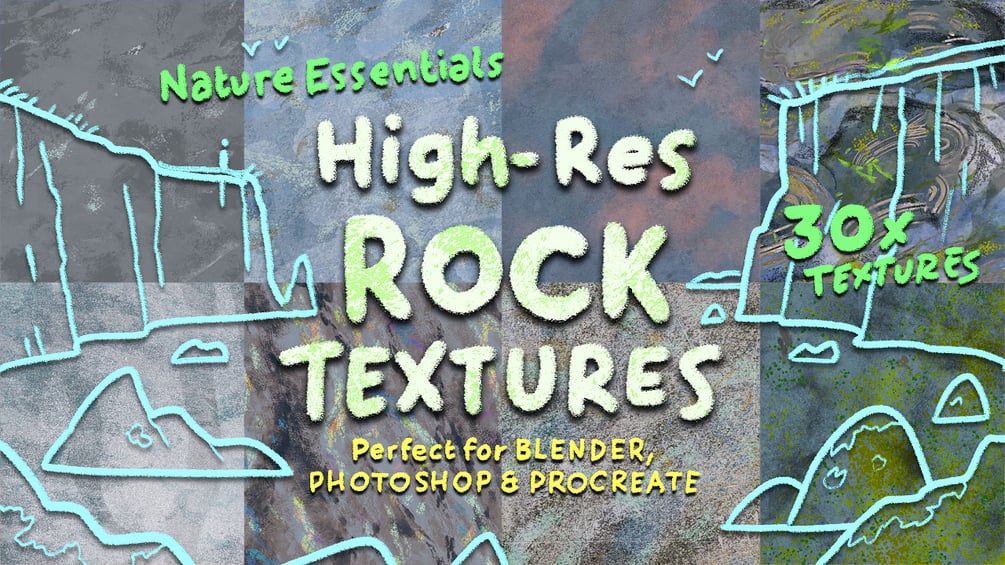 Here they are, my whole collection of Rock Textures that I've painted, and they're available to download. They come in handy SO often! I use them in Blender projects to map onto rocks or grounds or walls. In Photoshop illustrations they're perfect to drop in and make your environments more interesting. They'll work in your animation projects in After Effects too.
